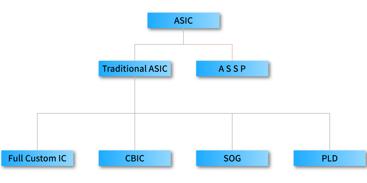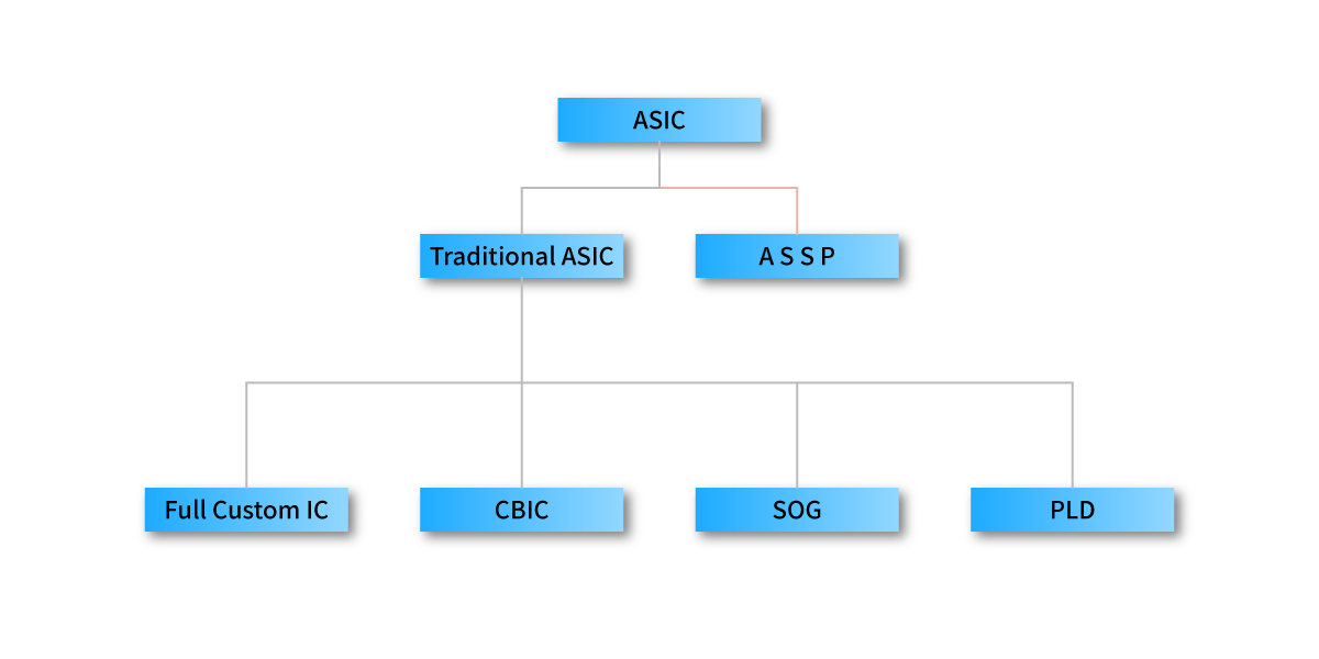 ASICÀº Ư¼º¿¡ µû¶ó Full custom IC, CBIC(Cell Based IC), SOG(Sea of gate), PLD(Programmable Logic Device)·Î ºÐ·ù µÇ¸ç, ³ÐÀº Àǹ̷Π»ó¿ëÈµÈ ºÎǰµéÀ» ¶æÇÏ´ÂASSP(Application Specific Standard product)¸¦ Æ÷ÇÔÇϱ⵵ ÇÑ´Ù.